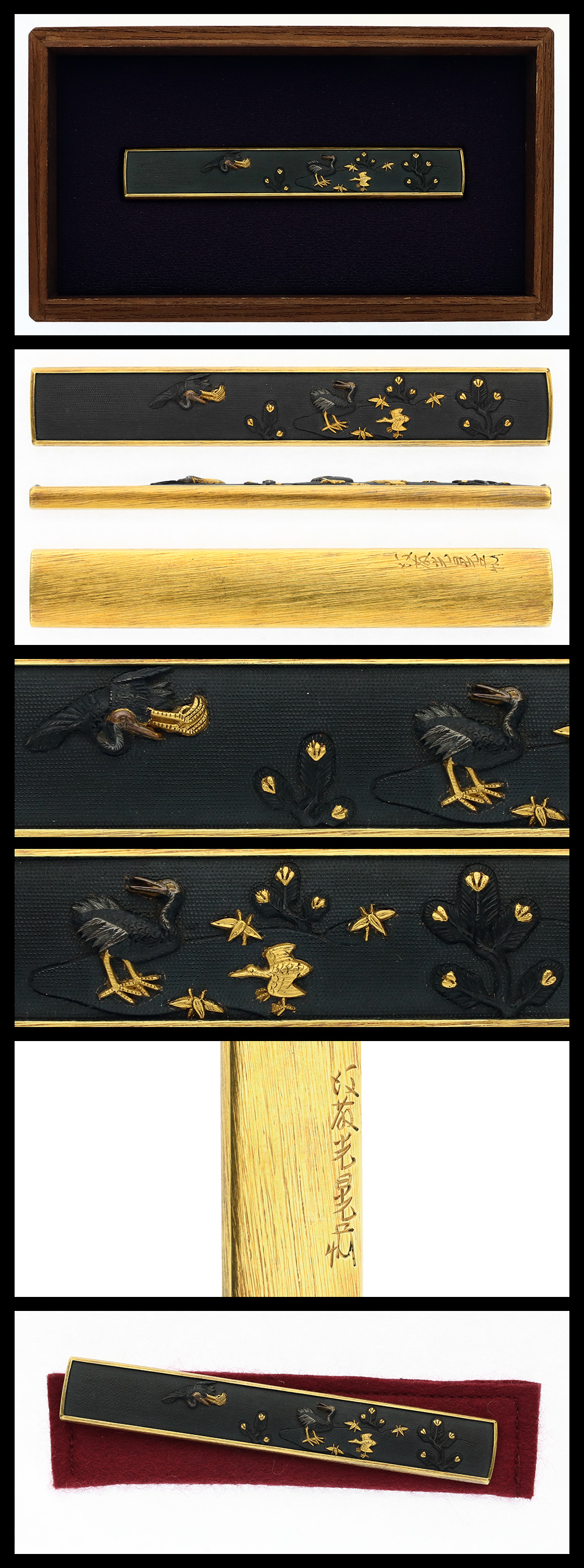 特徴:赤銅魚子地に若松親子鶴図を高彫り金銀色絵する。