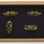 赤銅魚子地に蓑、笠、小槌の宝尽図を高彫りし金で色絵をほどこす。
