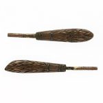 特徴:鉄の目貫に鬼瓦の図を彫り、象嵌色絵を施す。