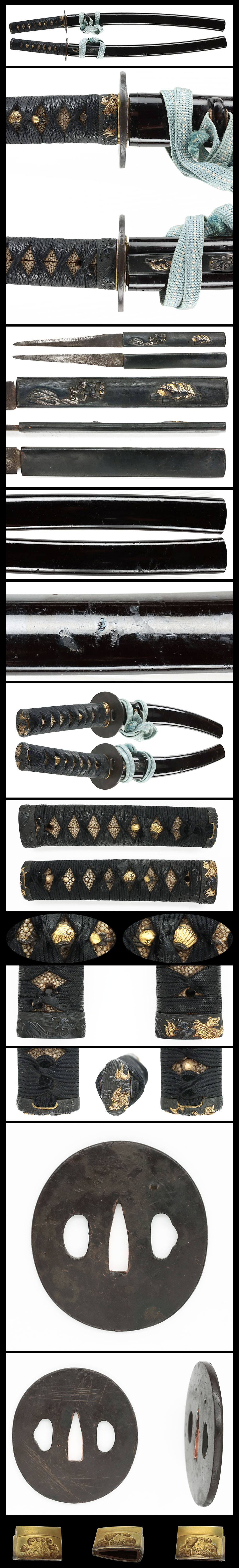 縁頭:赤銅魚子地に波と龍亀の図柄を高彫りし金色絵。