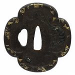 特徴:丸形鉄地に許由巣父図を鋤出高彫り、象嵌色絵を施す。