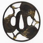 特徴:変形の鉄地に鬼の図を容彫り金色絵を施す。