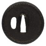 時代:江戸時代 特徴:鉄地鐔に武鑑を透かし彫りし、真鍮象嵌をほどこす。
