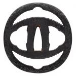 時代:江戸時代 特徴:赤銅魚子地に七福神(見えるのは三人)の乗った宝船と鶴と亀の図を象嵌で金銀銅の象嵌で入れる。気が晴れるような縁起の良い意匠です。
