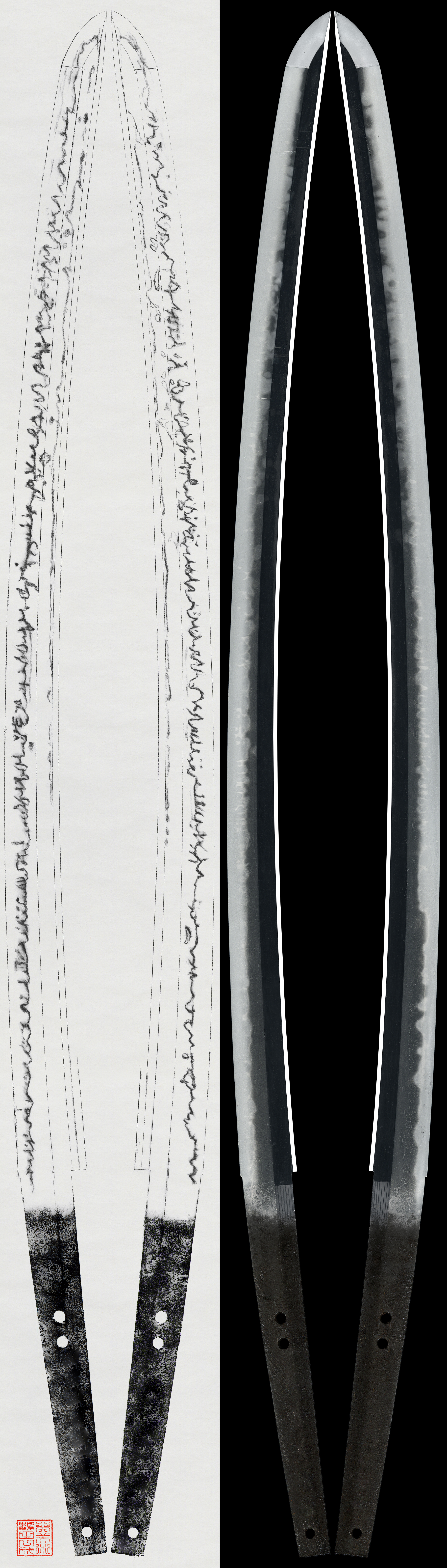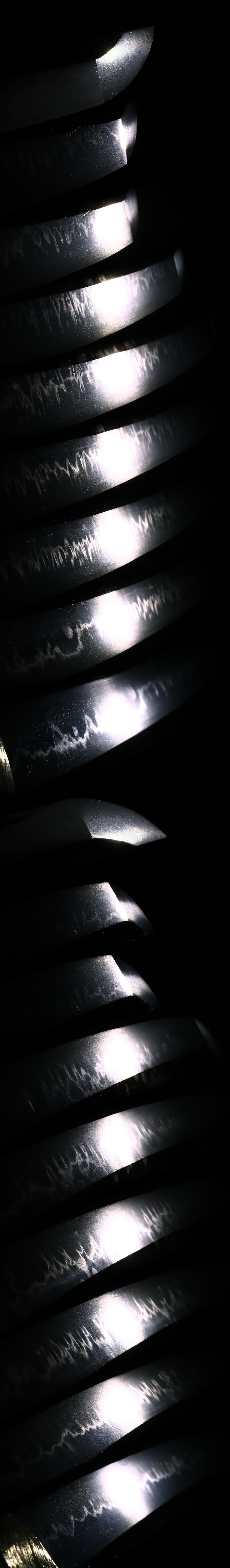 特徴:長谷部国重は南北朝時代、貞和1345年頃に活躍した刀工です。本作は茎が広く、三つ棟となり、その前身である秋広・広光と何らかの関係があったと言われている。この皆焼の刃紋はわずかな刀工が制作していったと考えられ独特な刃紋となる。